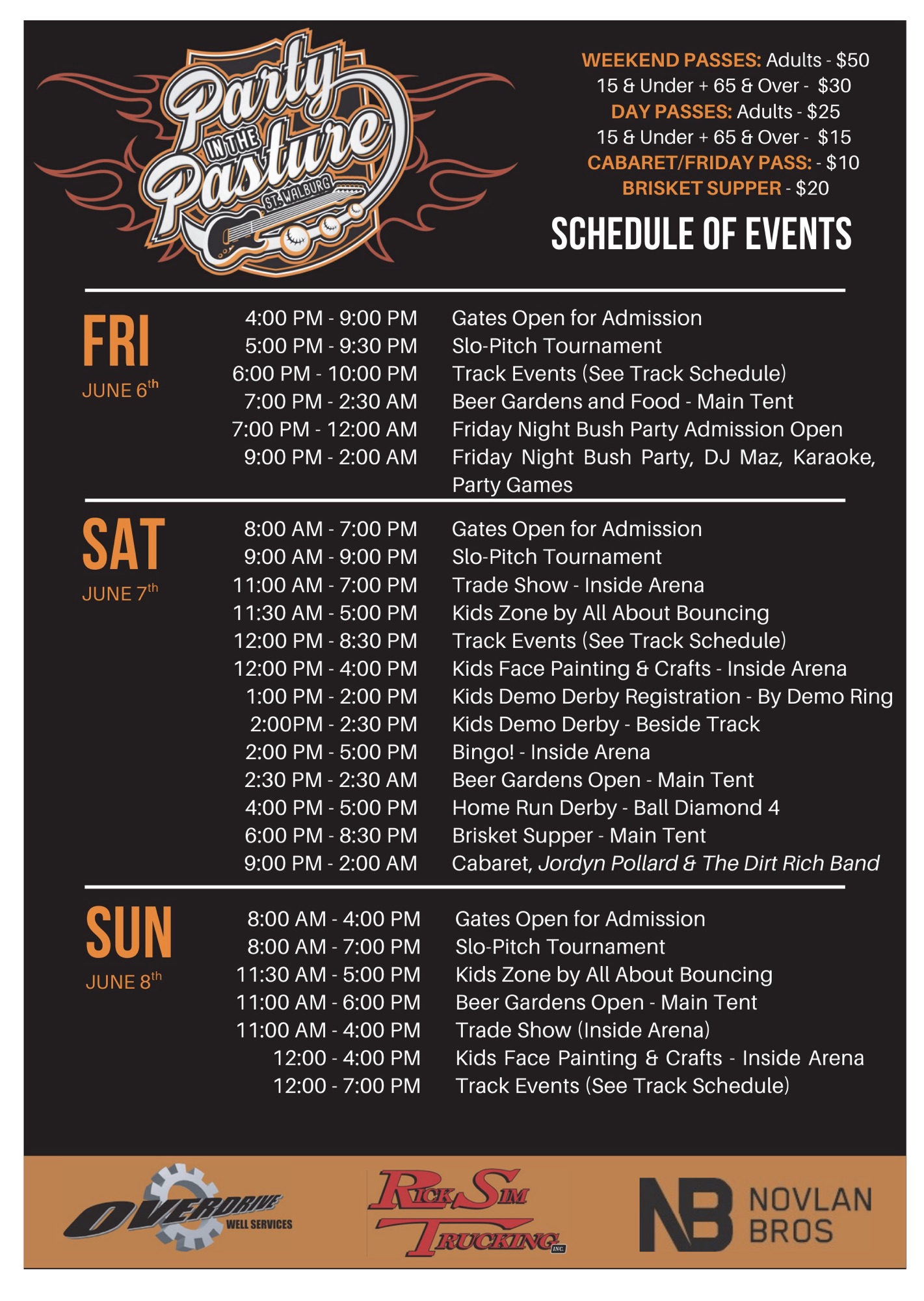 We are pleased to announce that the Canadian Mudracers’ Organization, Tuff Trucks, Alberta ATV Racing, and Demolition Derby will be returning after last years’ success with a 3 day meet. The Slo Pitch tournament will consist of 24 teams. Cabarets both Friday and Saturday nights, combined with our ever popular online auction, kids’ activities and our famous beer gardens will cap off the weekend events.